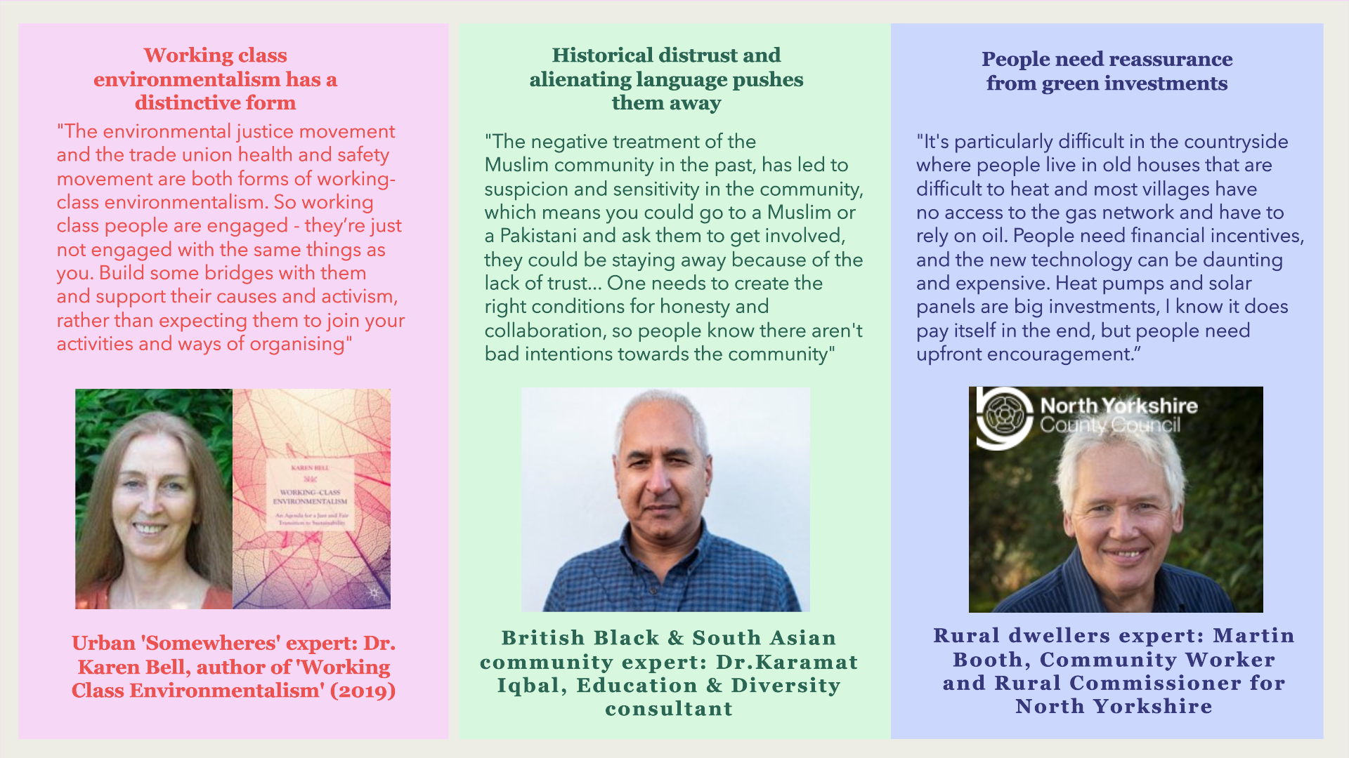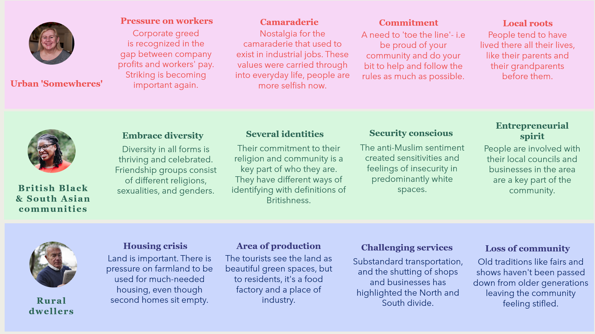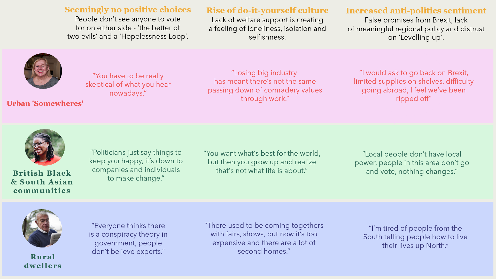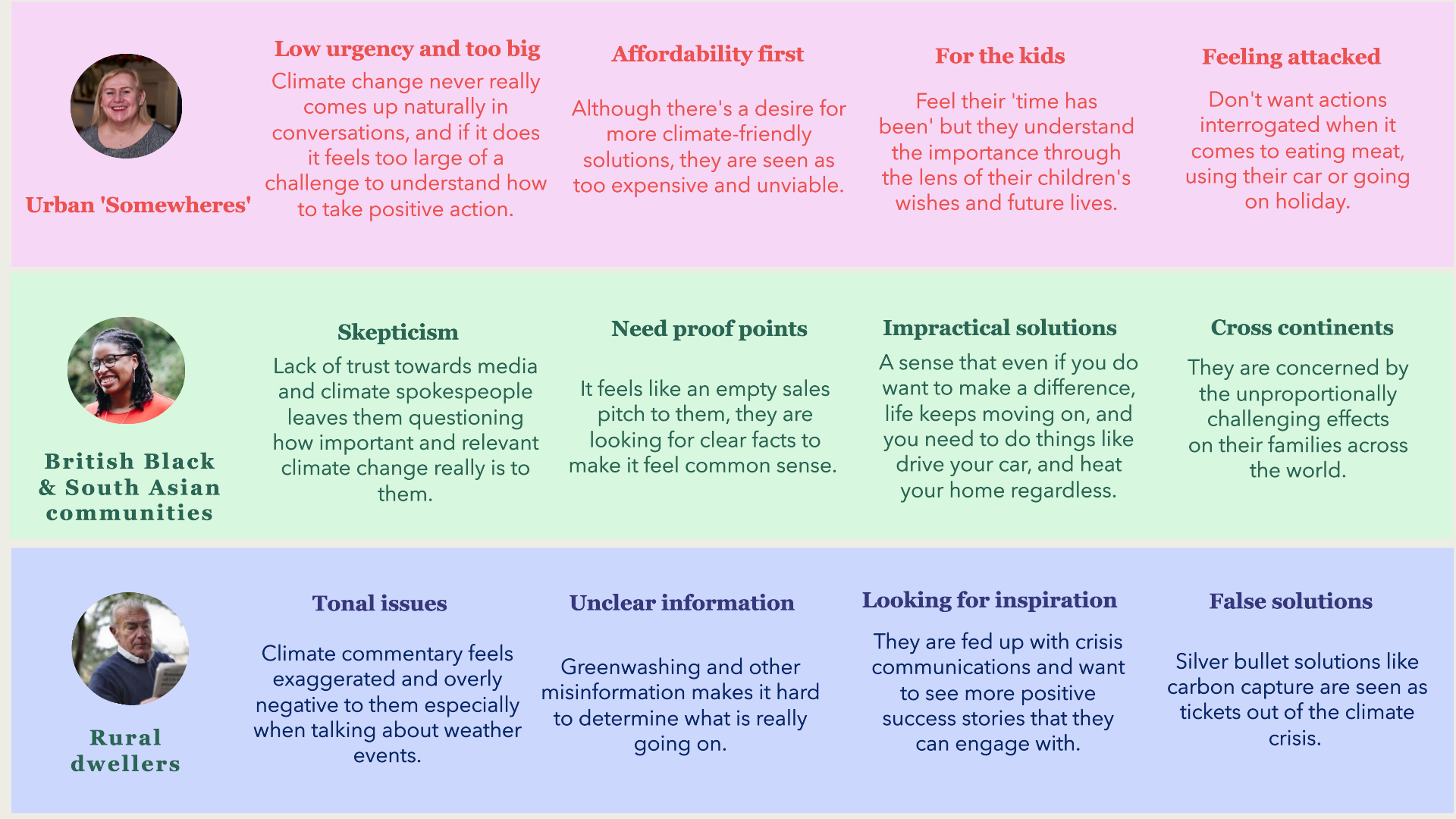 Whilst a feeling of apathy and distrust towards the climate movement united them all, each group had differing perspectives on climate. Urban Somewheres felt priced out, British Black & South Asian communities felt deeply sceptical, and Rural Dwellers felt lost and left behind.