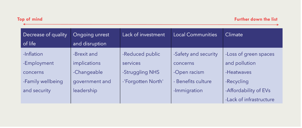 When asked to speak about the top 5 biggest challenges they currently faced, many couldn't think beyond the cost of living crisis, which is effecting their ability to heat their homes, feed their family, and feel secure in their jobs. Other than this, there were a host of other issues that concerned them, many of them only remembering about climate changed when prompted in the research.